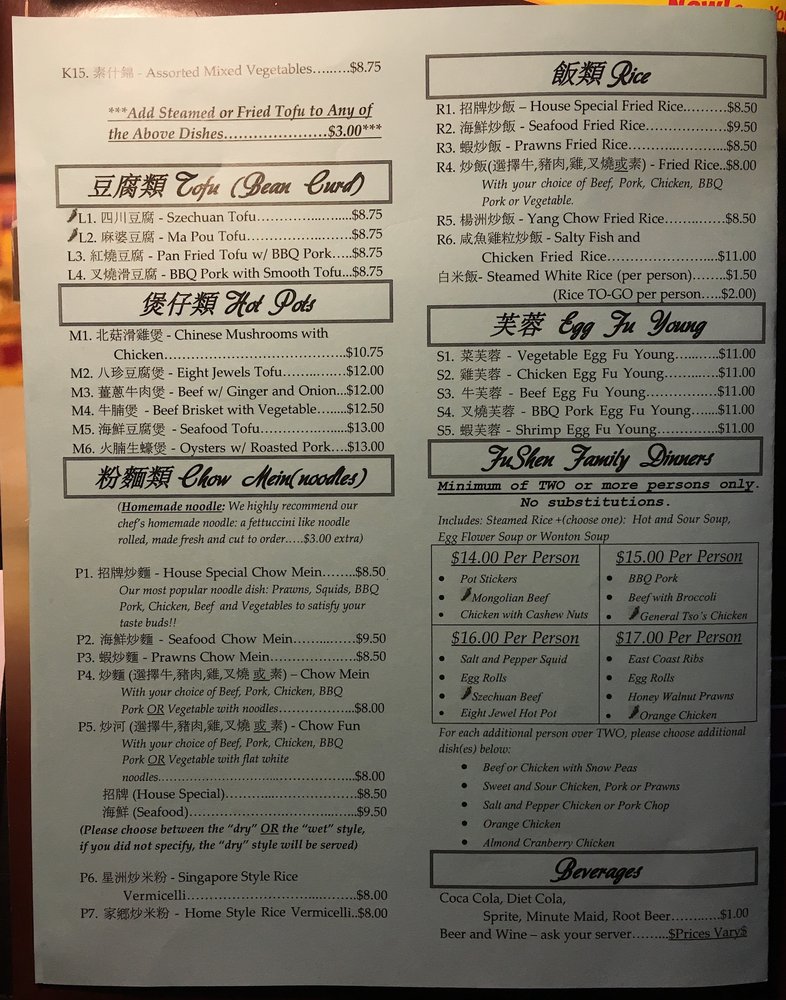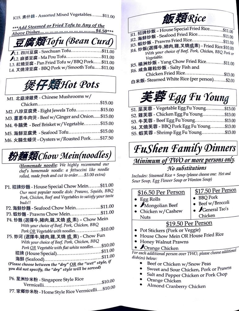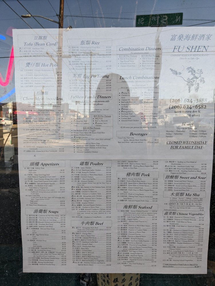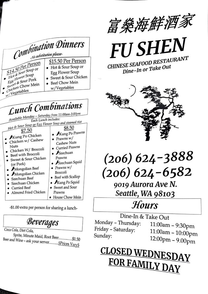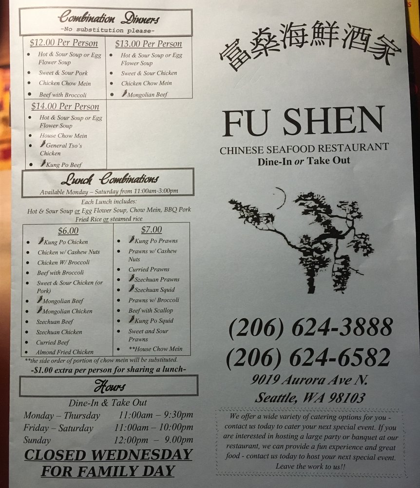 Introducing the menu at Fu Shen, a Chinese restaurant located at 9019 Aurora Ave N in Seattle, WA. This casual and quiet spot offers a wide range of options, including many vegetarian choices. With its friendly service and delicious food, Fu Shen is a local favorite for takeout and catering. Some must-try dishes include the B.B.Q. Pork, Honey Walnut Prawns, and homemade Lo Mein noodles. Customers rave about the consistency and quality of the food, as well as the generous portions. The handmade noodles and pot stickers are highly recommended. Don't miss out on the authentic Chinese flavors and warm hospitality at Fu Shen.