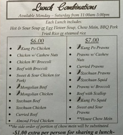 Hot & Sour Soup or Egg Flower Soup, Sweet & Sour Pork, Chicken Chow Mein, Beef with Broccoli