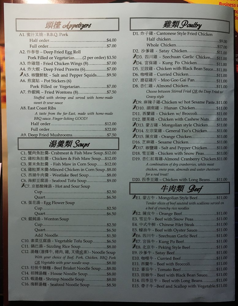 Hot & Sour Soup or Egg Flower Soup, Sweet & Sour Chicken, Pork Chow Mein, Mongolian Beef